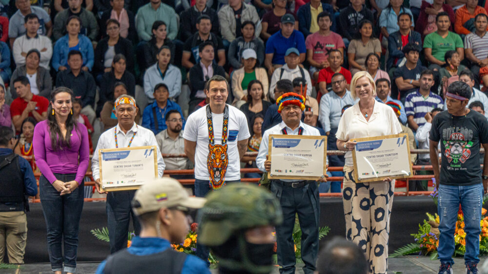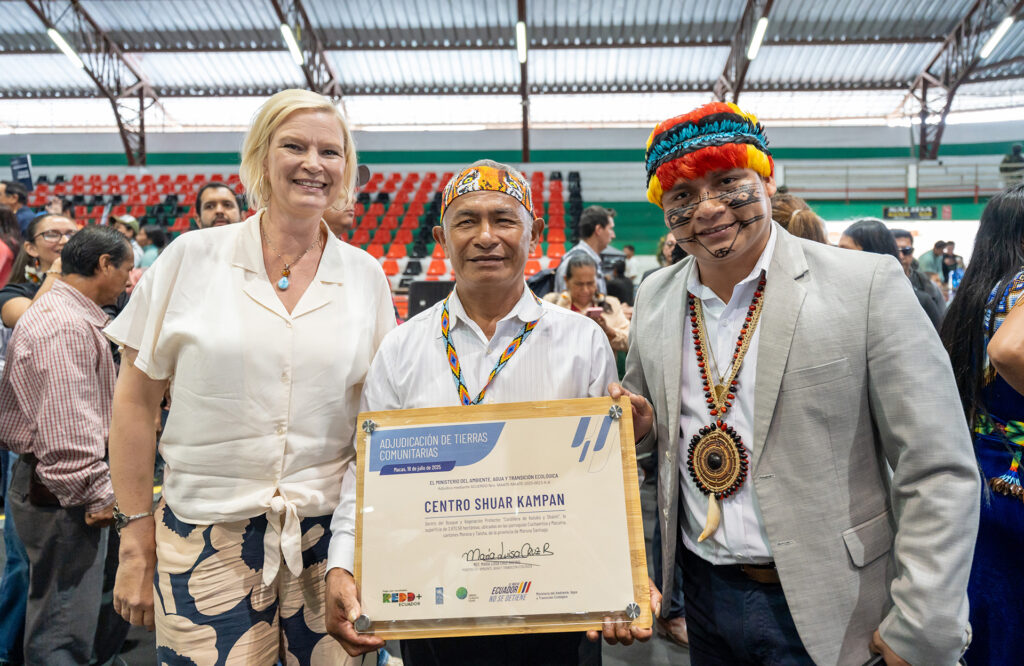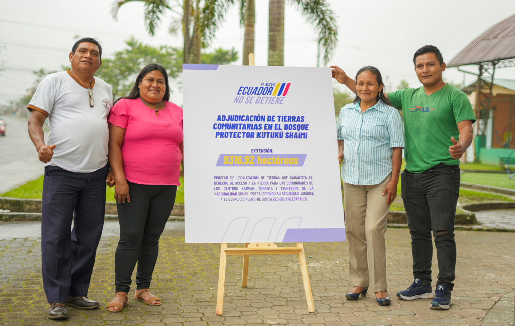 Macas, 18 de julio de 2025.- En un acto histórico presidido por el Presidente de la República, el Gobierno del Ecuador entregó este viernes los títulos de adjudicación de tierras a los Centros Shuar Tunants, Kampan y Tsuntsuim, ubicados en el Bosque Protector Kutukú Shaimi, en la provincia de Morona Santiago. Esta entrega es un hito en el proceso de restitución de derechos territoriales colectivos, luego de más de una década sin adjudicaciones dentro del Patrimonio Forestal del Estado.