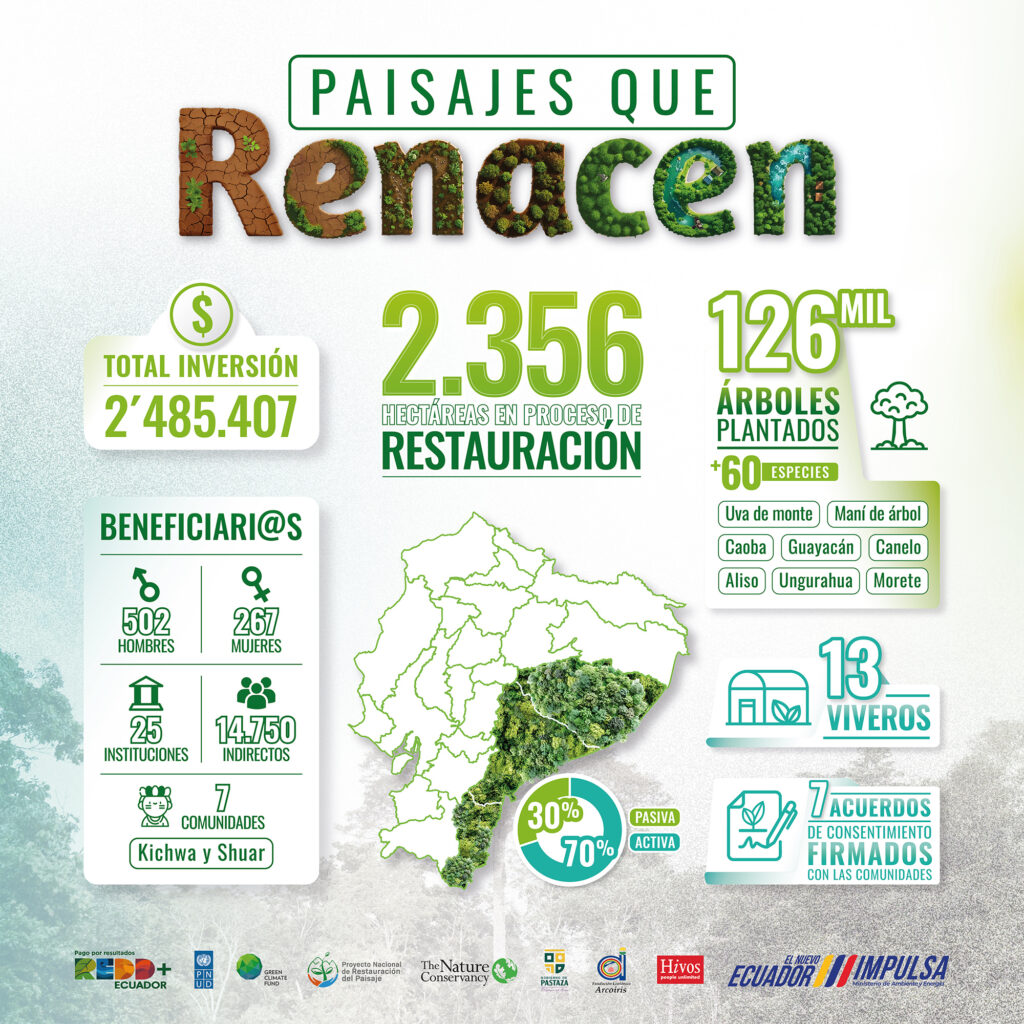 Con el apoyo del PNUD, y la participación de socios como la Fundación Ecológica Arcoíris, Hivos y el Consorcio Reforestación Pastaza (conformado por The Nature Conservancy y el Gobierno Provincial de Pastaza), se han implementado acciones que integran conocimiento técnico, saber ancestral y participación comunitaria, bajo un enfoque de salvaguardas sociales, género e interculturalidad.